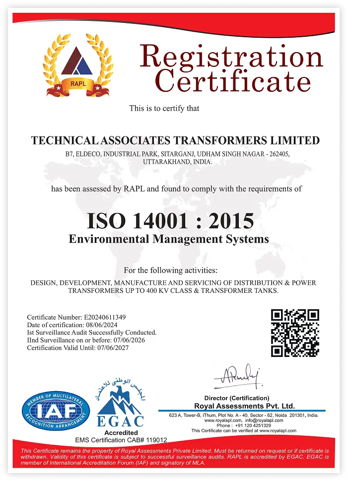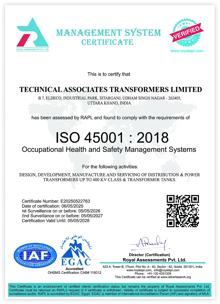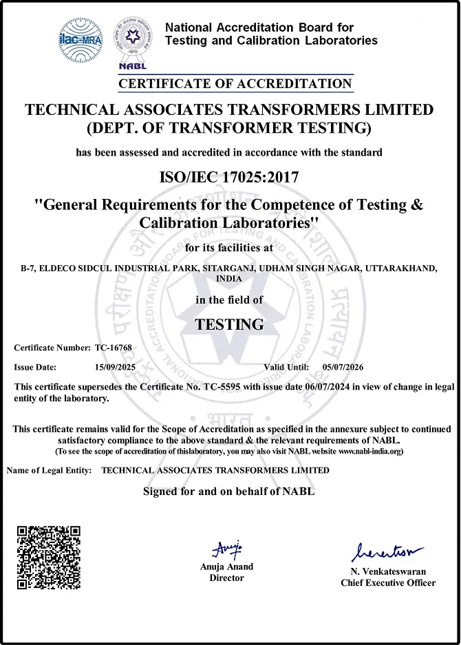 TATL holds globally recognised certifications that validate our precision-led manufacturing and testing practices, ensuring consistent quality, proven reliability, and adherence to international standards across all transformer classes.