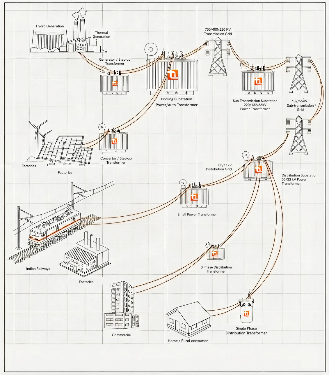 Our manufacturing range spans the entire spectrum of transformers required for delivering power to consumers – from Generation to Transmission to Distribution – making us the transformer manufacturer with the widest range in India.TATL delivers specialised Power Transformer solutions for Metro, Trackside applications and MRTS, making it a trusted engineering partner for standardised and customised transformer requirements across Railway and Metro systems. Its proven capabilities ensure reliable performance for modern transit infrastructure.